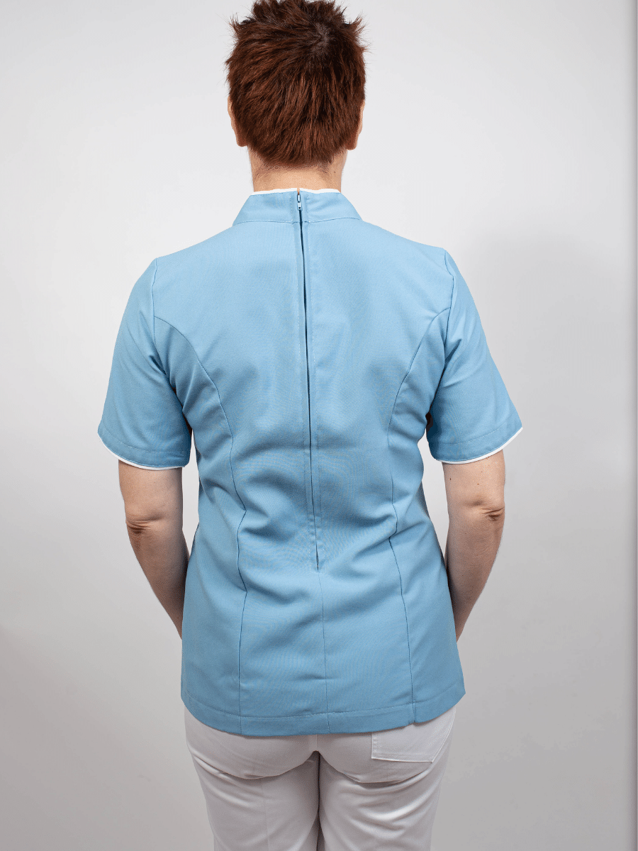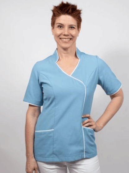 Blusón manga corta con cuello femenino, sesgo blanco.