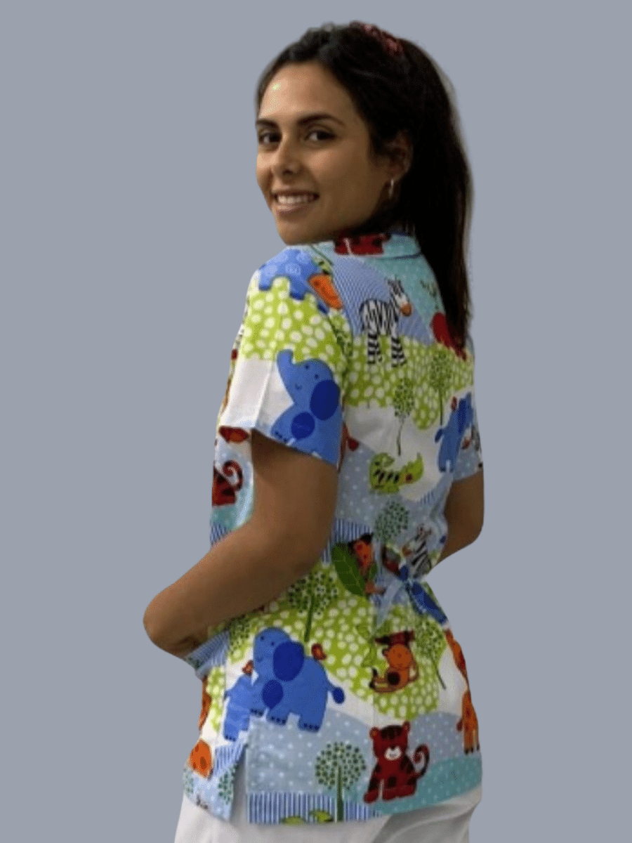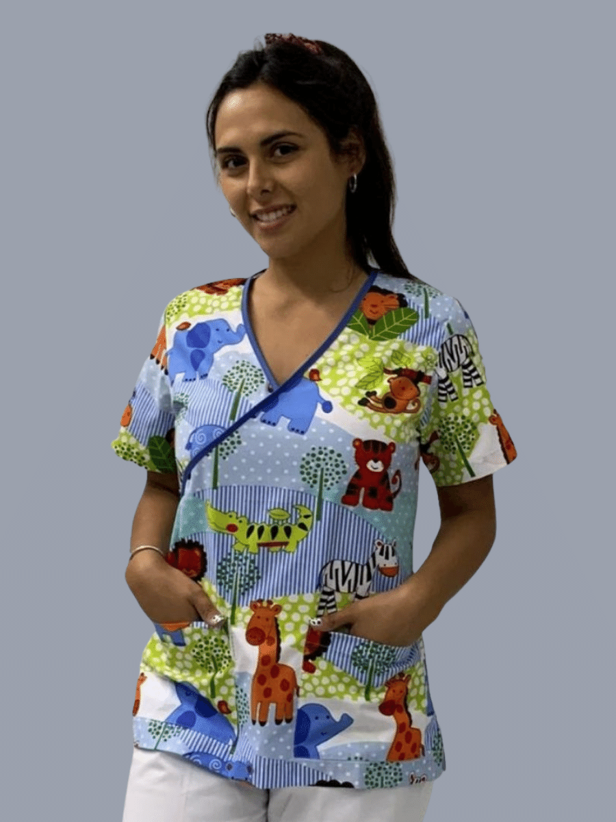 Fondo blanco con animales de África en azul, verde, naranja vivo azulino en escote y bolsillos.