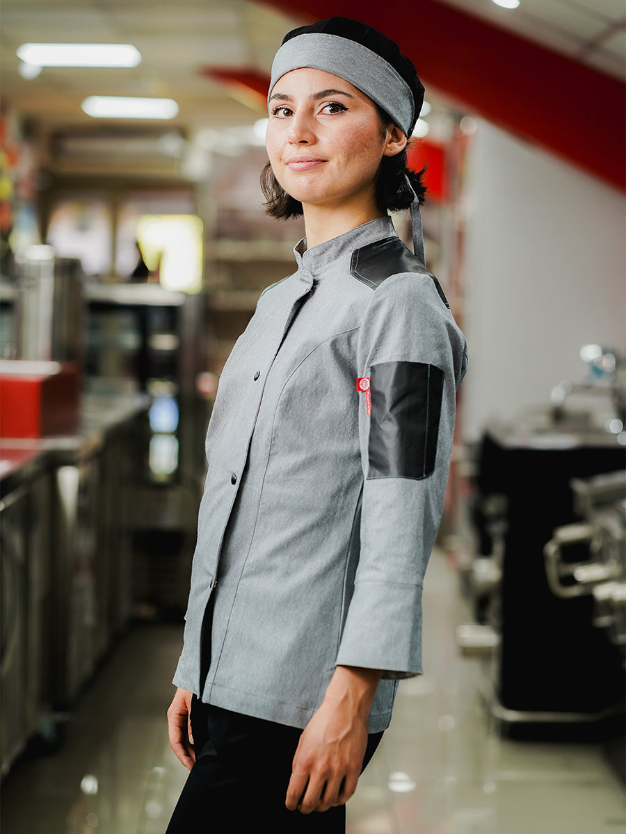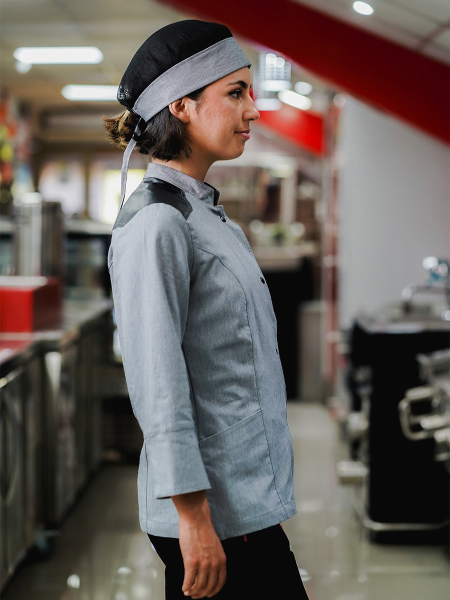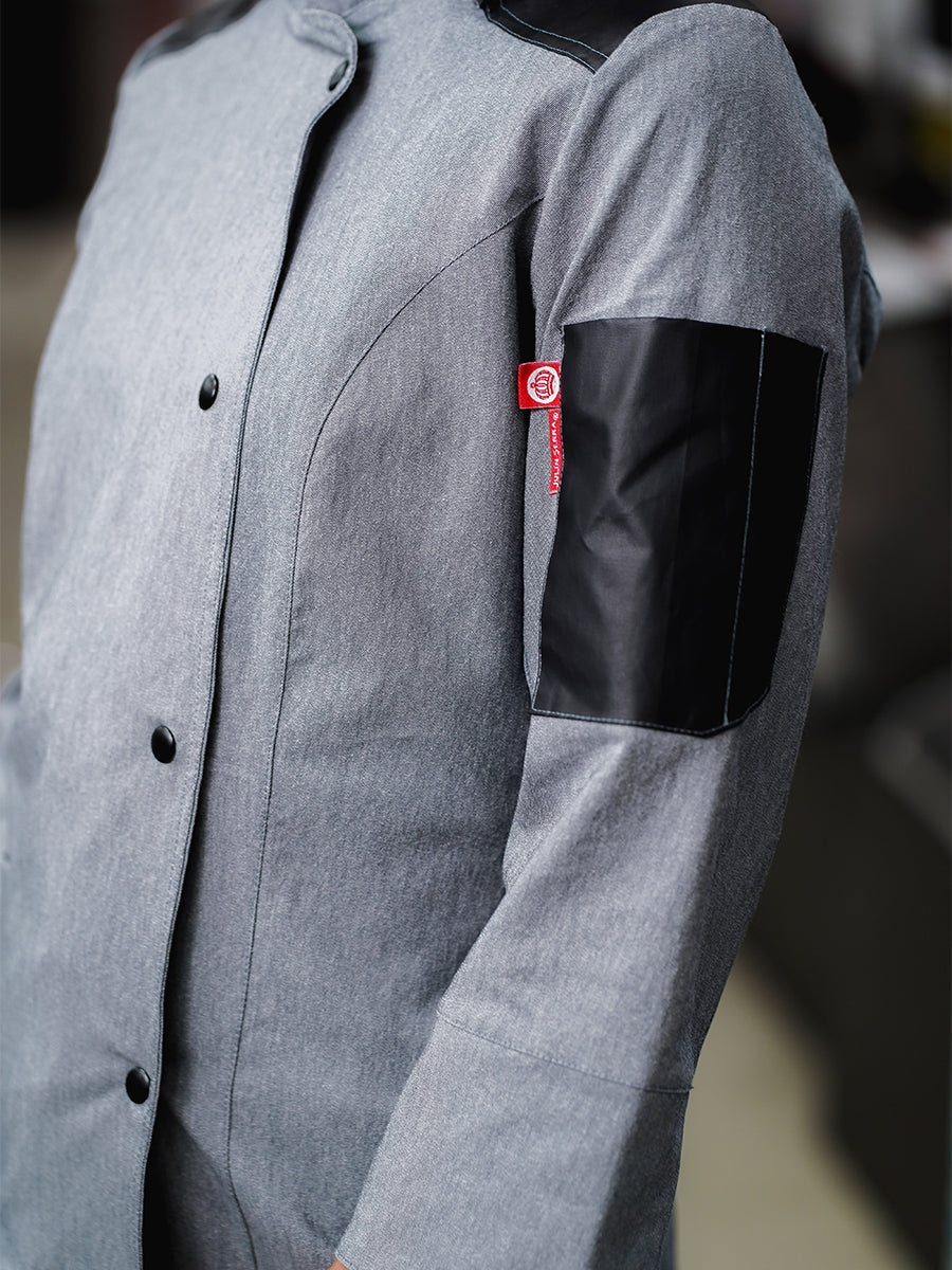 Chaqueta gris con cruce al costado izquierdo y broches a presión negros, incluye bolsillo en manga para pinzas y accesorios, y bolsillo inferior para celular o notas. Los detalles en resina negra estilo cuero realzan su estética moderna.