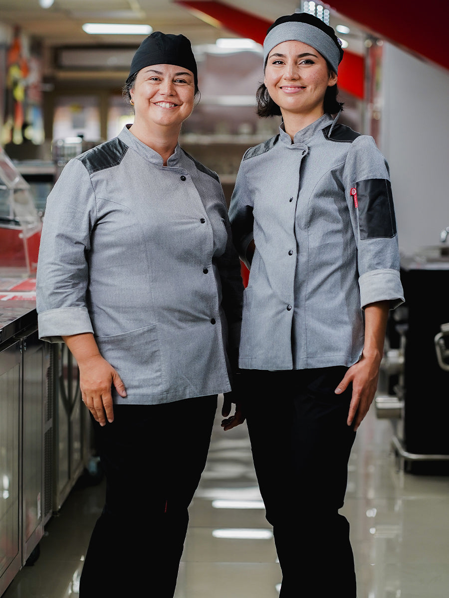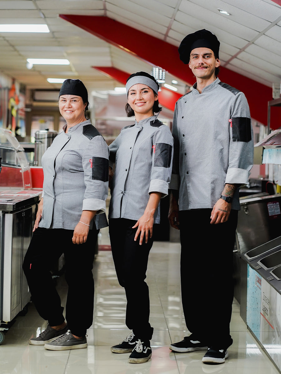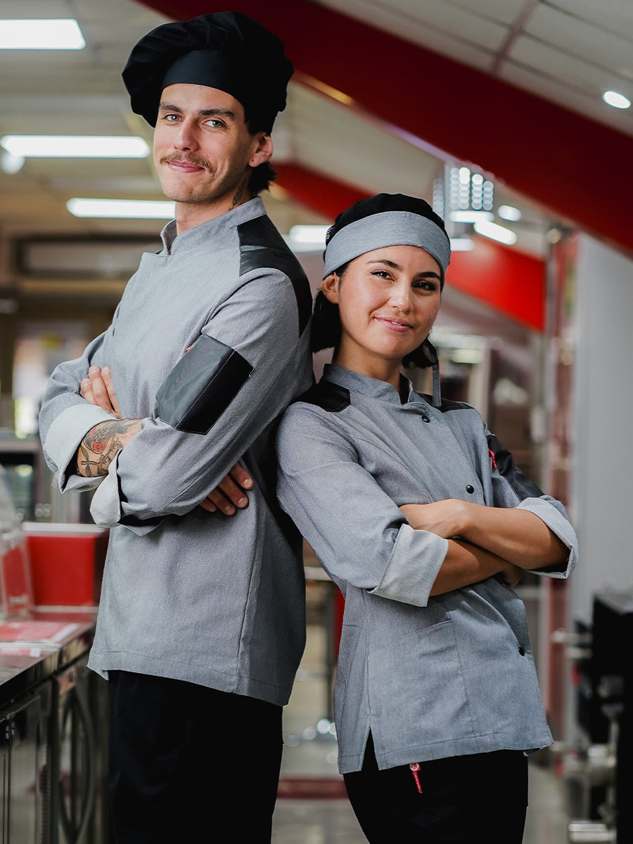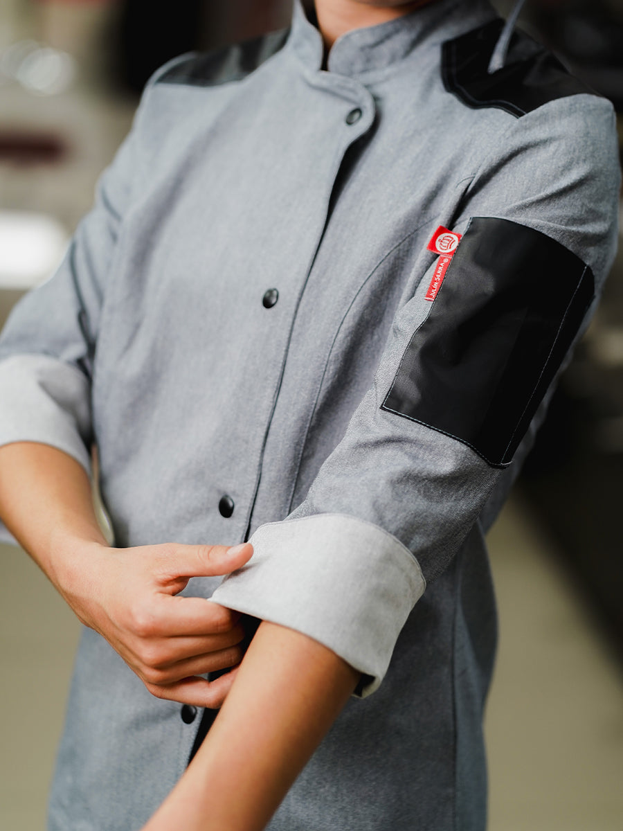 Chaqueta gris con cruce al costado izquierdo y broches a presión negros, incluye bolsillo en manga para pinzas y accesorios, y bolsillo inferior para celular o notas. Los detalles en resina negra estilo cuero realzan su estética moderna.