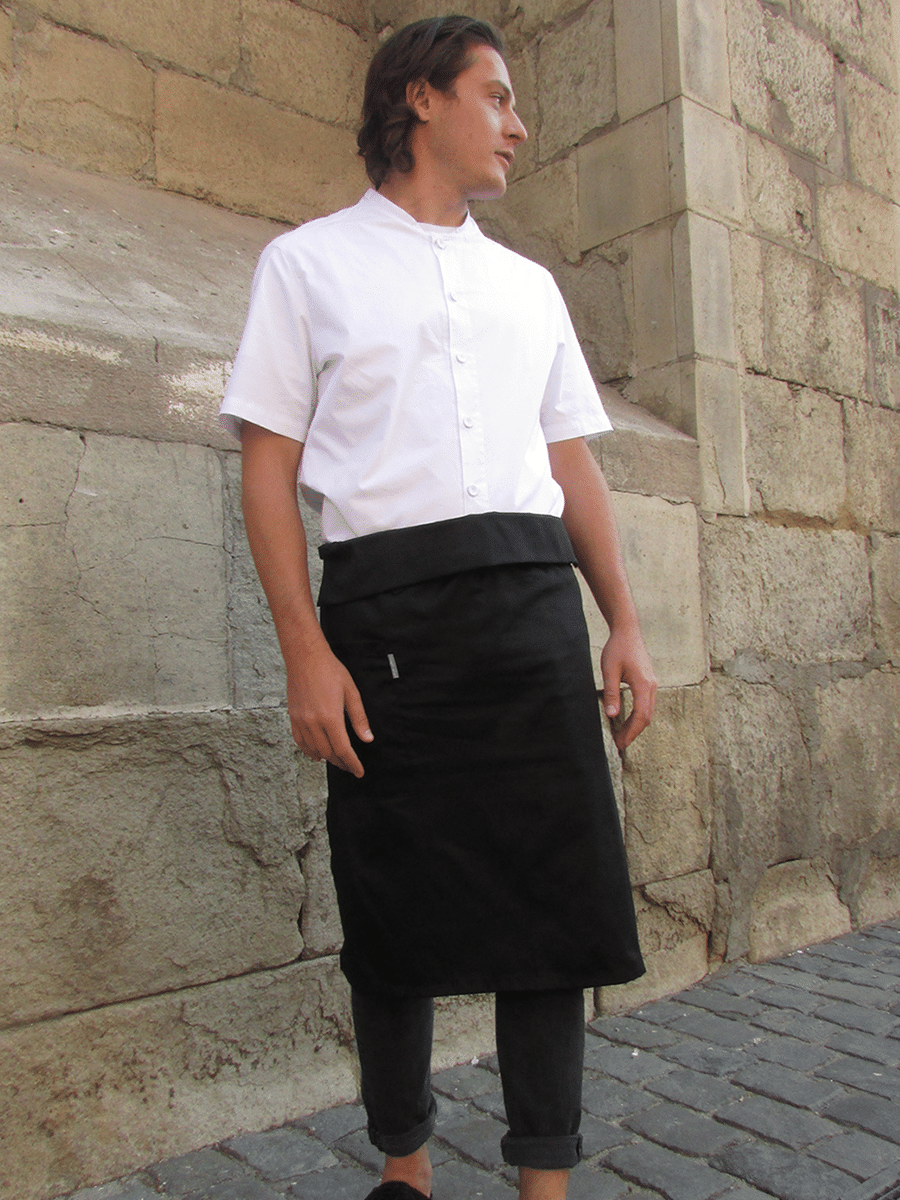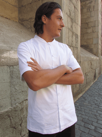 Chaqueta tipo camisa de cocina, manga corta, diseñada con abotonadura central simple y 6 botones forrados.