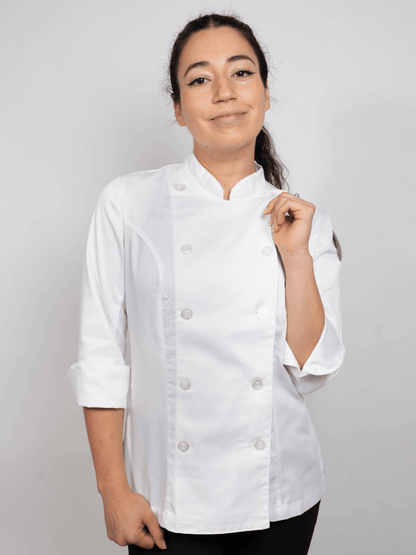 Chaqueta de cocina para mujer, doble abotonadura. Desarrollada en tela gabardina, lindo calce. Bolsillo en manga izquierda.