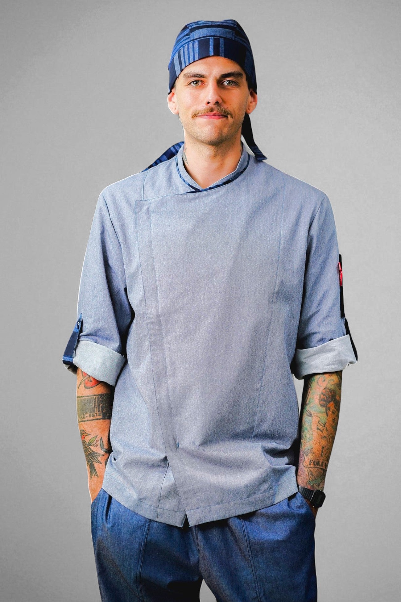 Chaqueta Harley en mezclilla delgada azul y aplicación denim listado