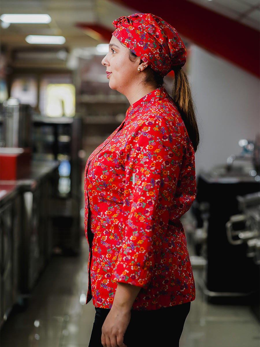 Chaqueta Laura en poly estampado rojo florcitas moradas y naranja SENA E06