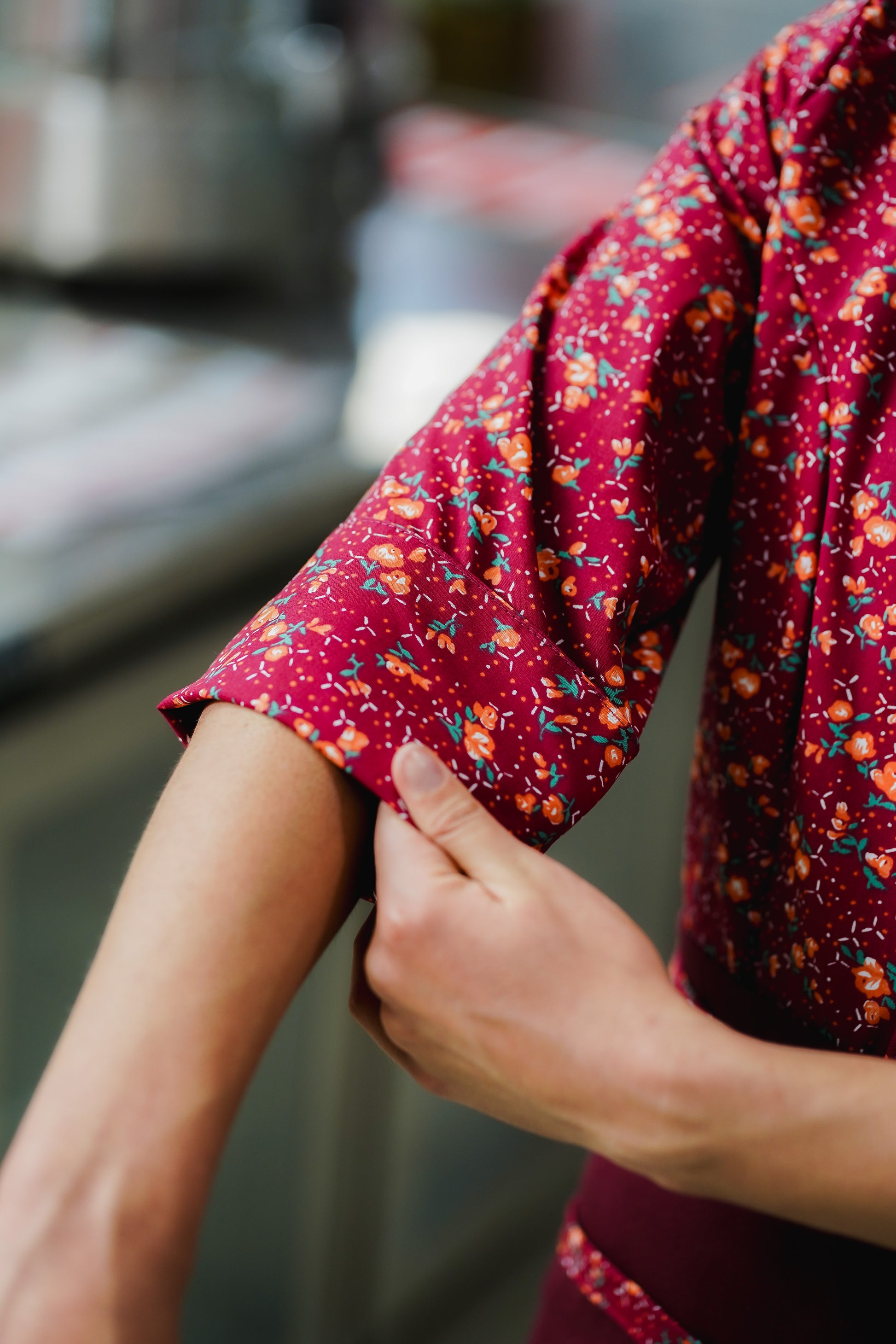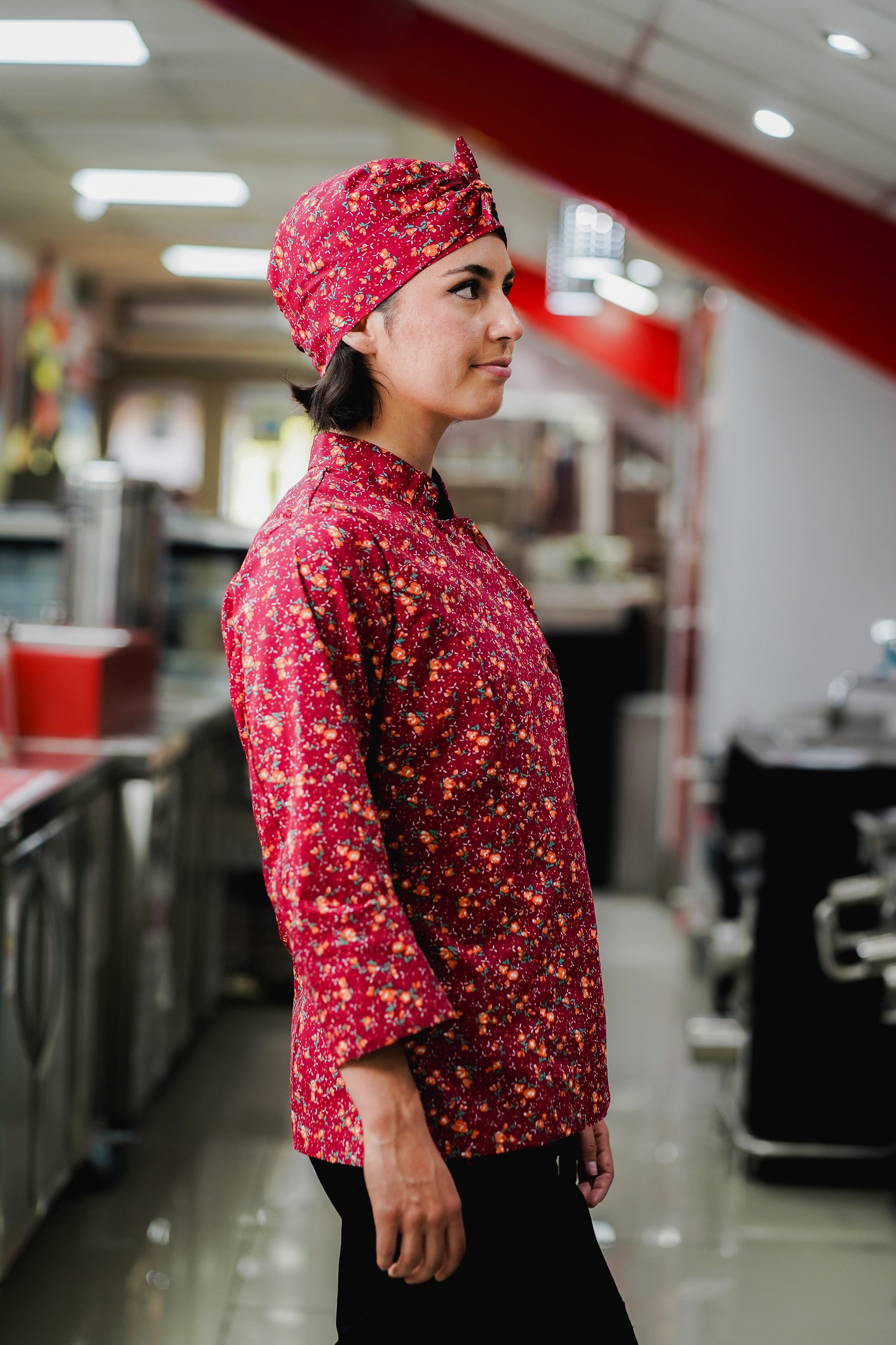 Las flores naranjas y verdes sobre fondo burdeo dialogan con los botones tono vino, creando una pieza armónica y distintiva.