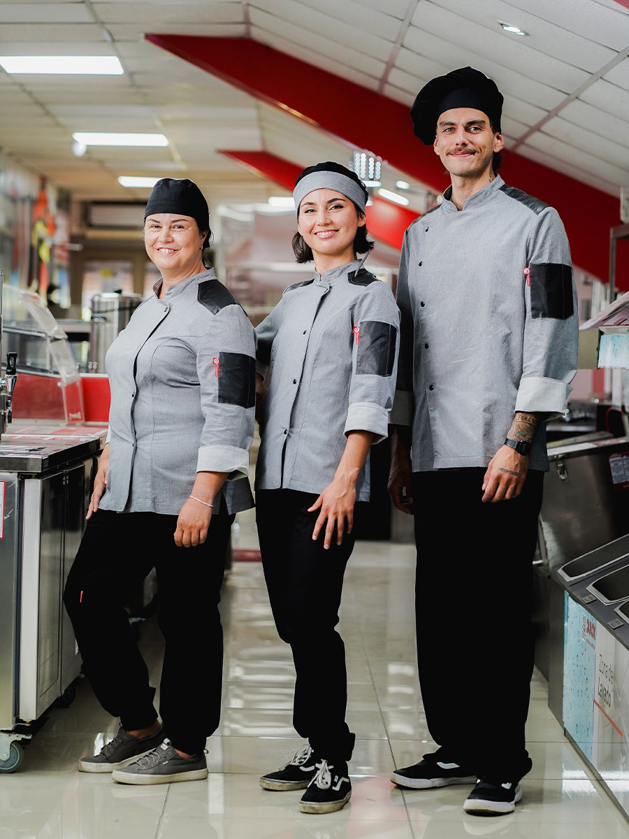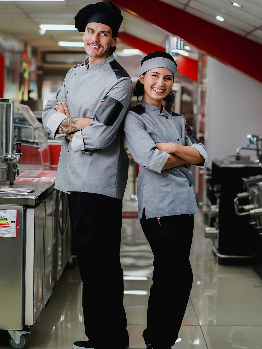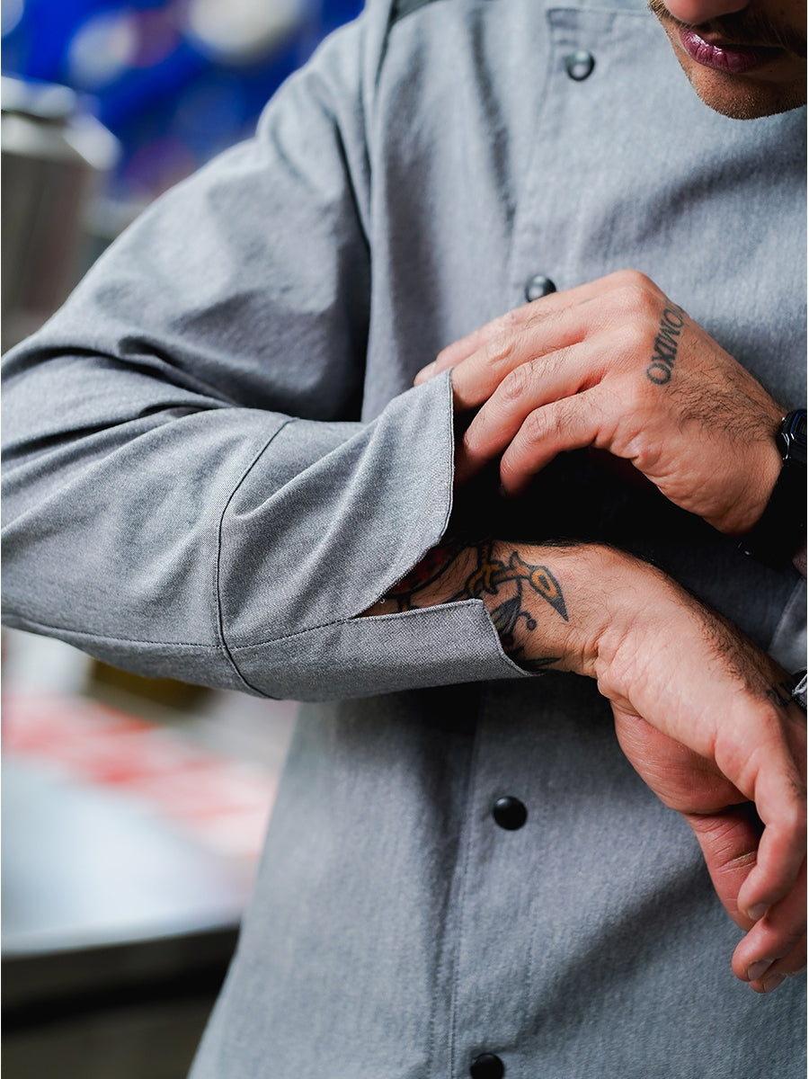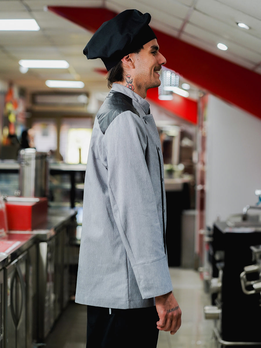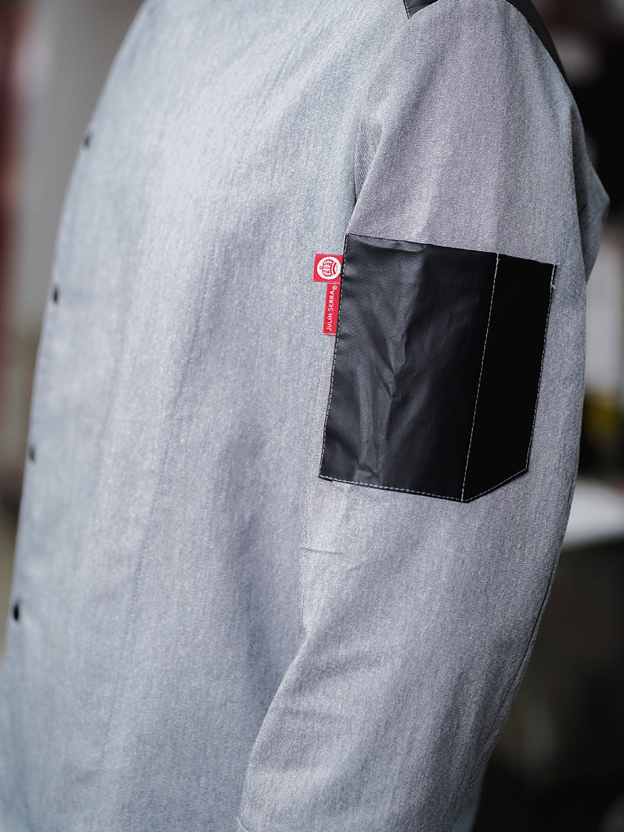 Chaqueta tipo chef motoquera, color gris, con broches a presión inoxidables negros y detalles en resina negra estilo cuero en canesú, delantero y mangas. Incluye un bolsillo con separaciones en la manga para mayor funcionalidad.