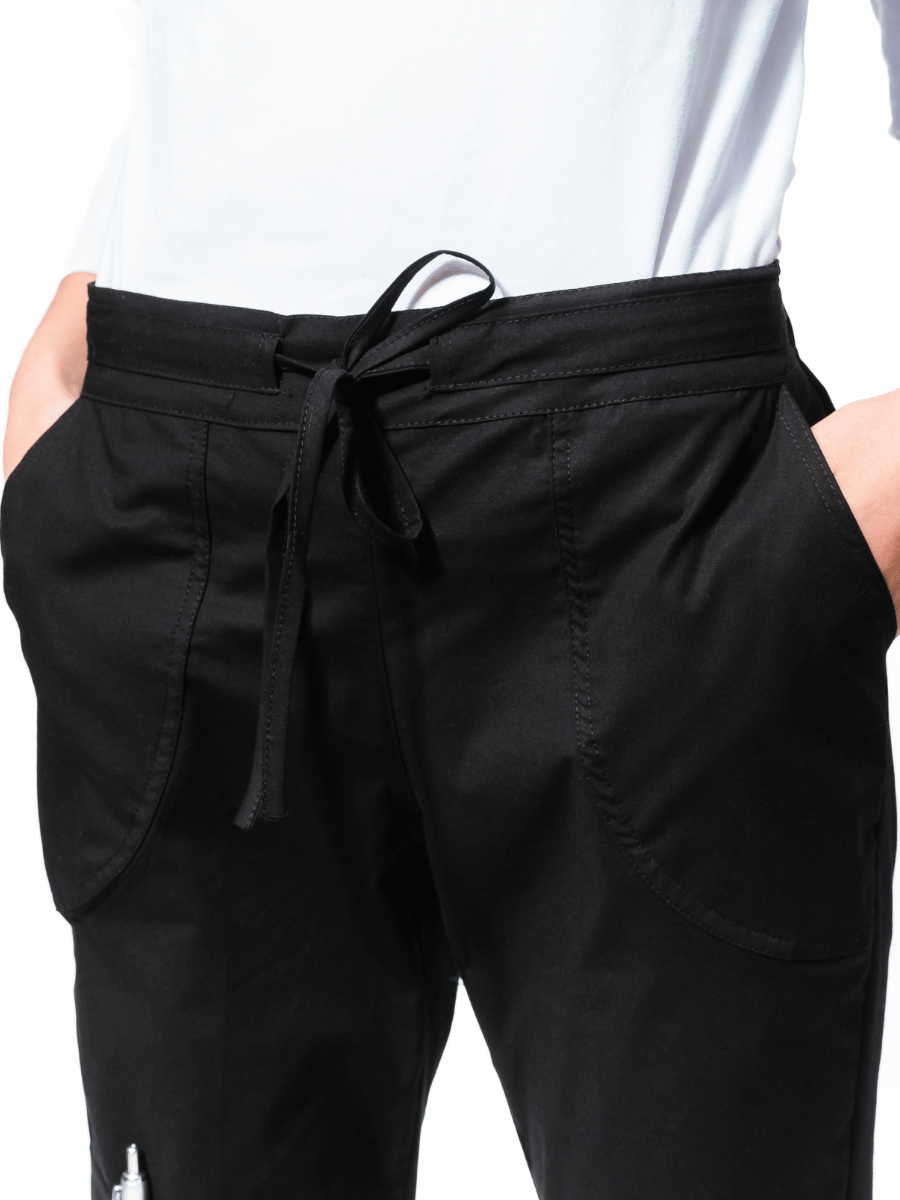 El pantalón tiene la cintura de la espalda elasticada y delantero liso con tiritas de ajuste. Dos bolsillos laterales y un bolsillo en la pierna con división para lápiz. Las piernas son angostas y con elásticos en los tobillos tipo jogger.
