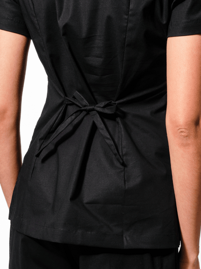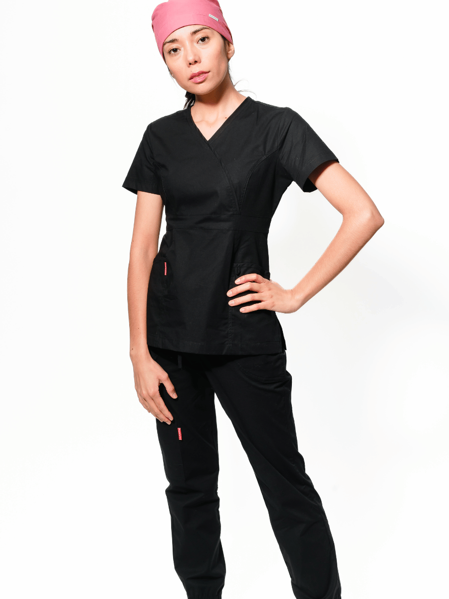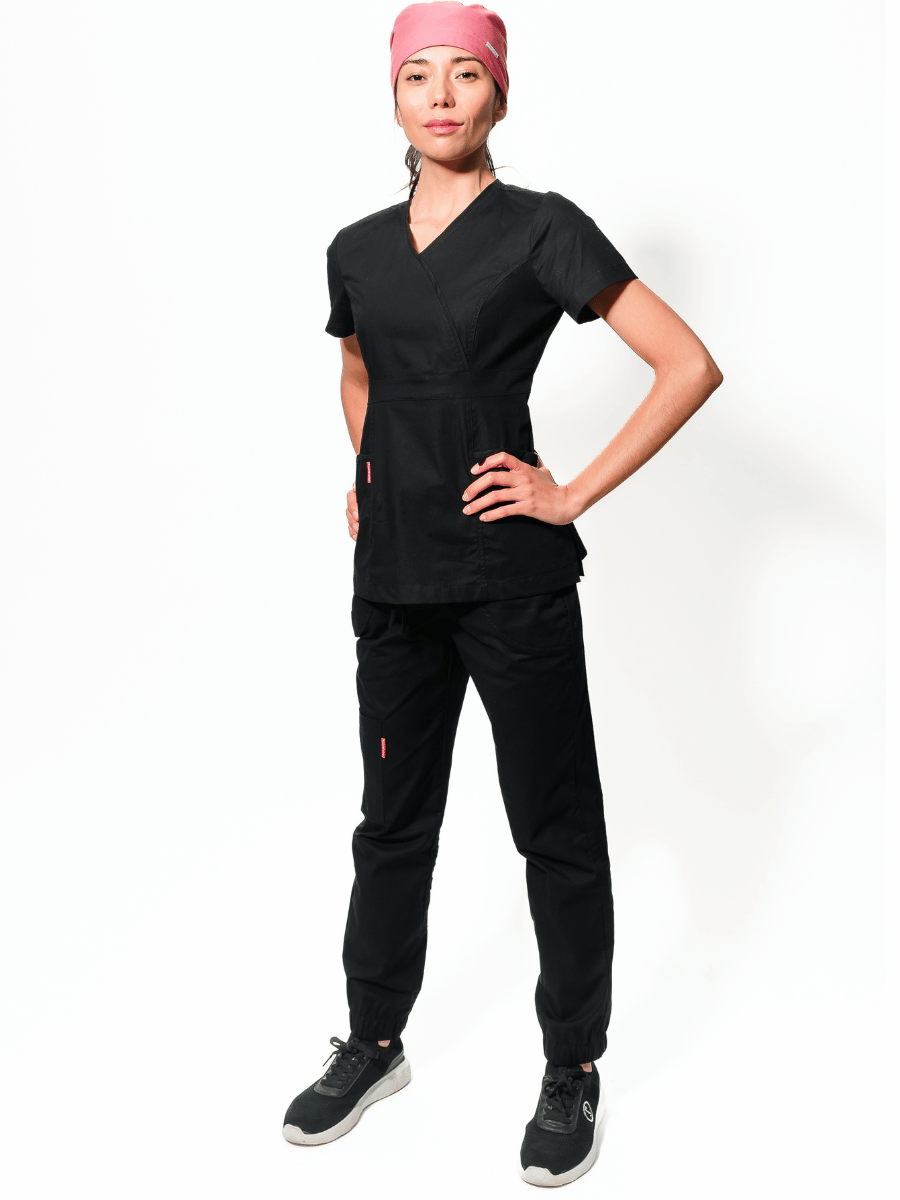 Conjunto clínico con un blusón modelo Clinic Fit manga corta con tiritas en la espalda para ajuste y un pantalón modelo Clinic Fit con pierna tipo jogger elasticado en el tobillo.