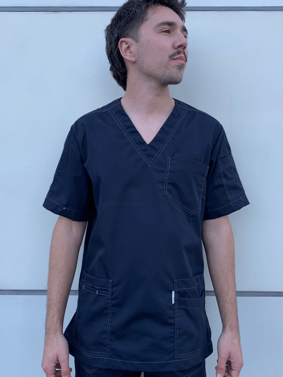 Blusón Scrub con escote V , 5 bolsillos (superior frontal, manga izquierda, derecho con traba multipropósito, inferior izquierdo doble para IPAD).