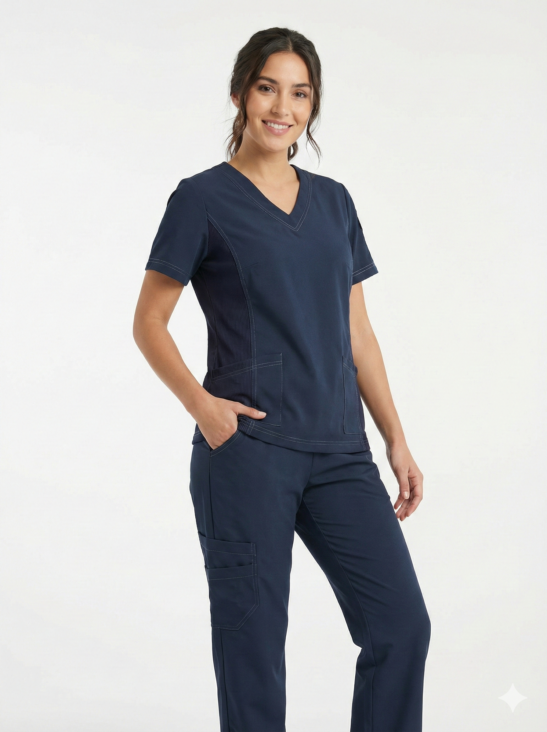 Pantalón clínico confeccionado en tela antifluido de alta tecnología, resistente, liviana y apta para rutinas exigentes. La pretina incorpora rib inteligente, lo que permite un ajuste firme sin perder comodidad.