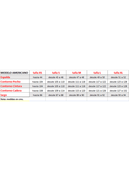 Revisa tu talla en la tabla de medidas. Considera 2 cms. más de tu medida personal y rígete por la talla más grande que obtengas.