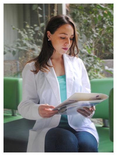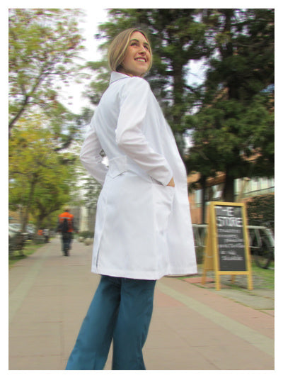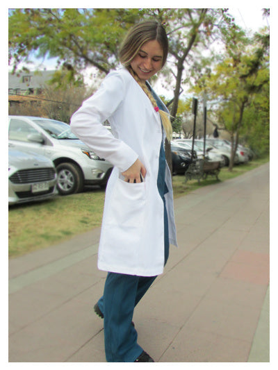 Solapa continua y largo a la rodilla, que le da un look moderno y diferente al clásico delantal clínico.