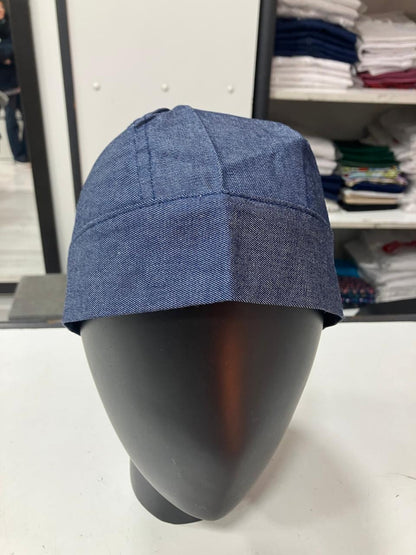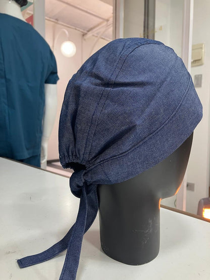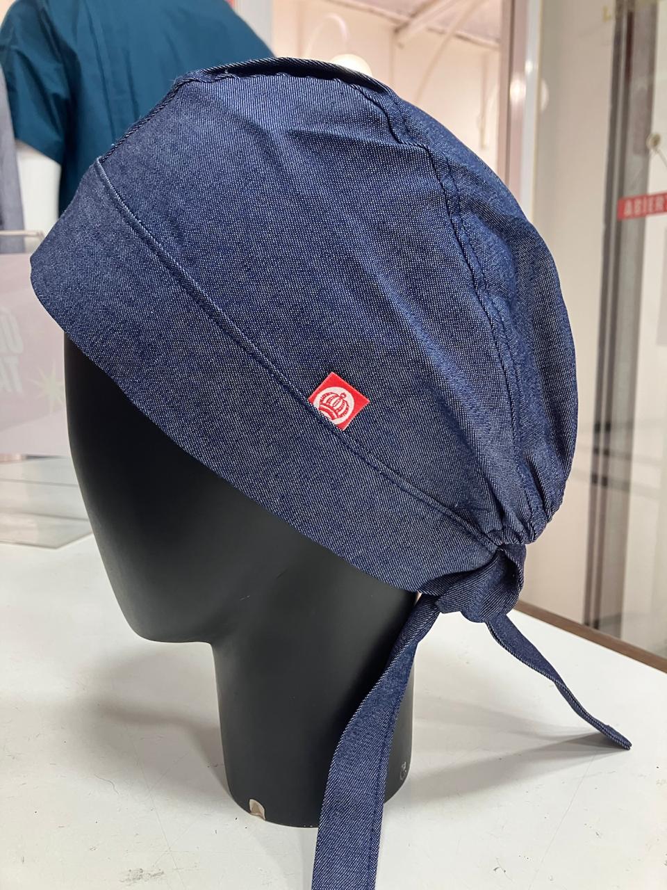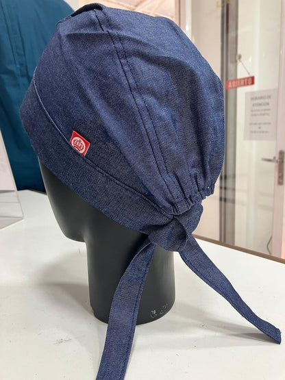 Gorro tipo Bandana en mezclilla delgada con amarras y elastico en la parte de atrás de la cabeza, permitiendo mayor flexibilidad o amplitud si se requiere.