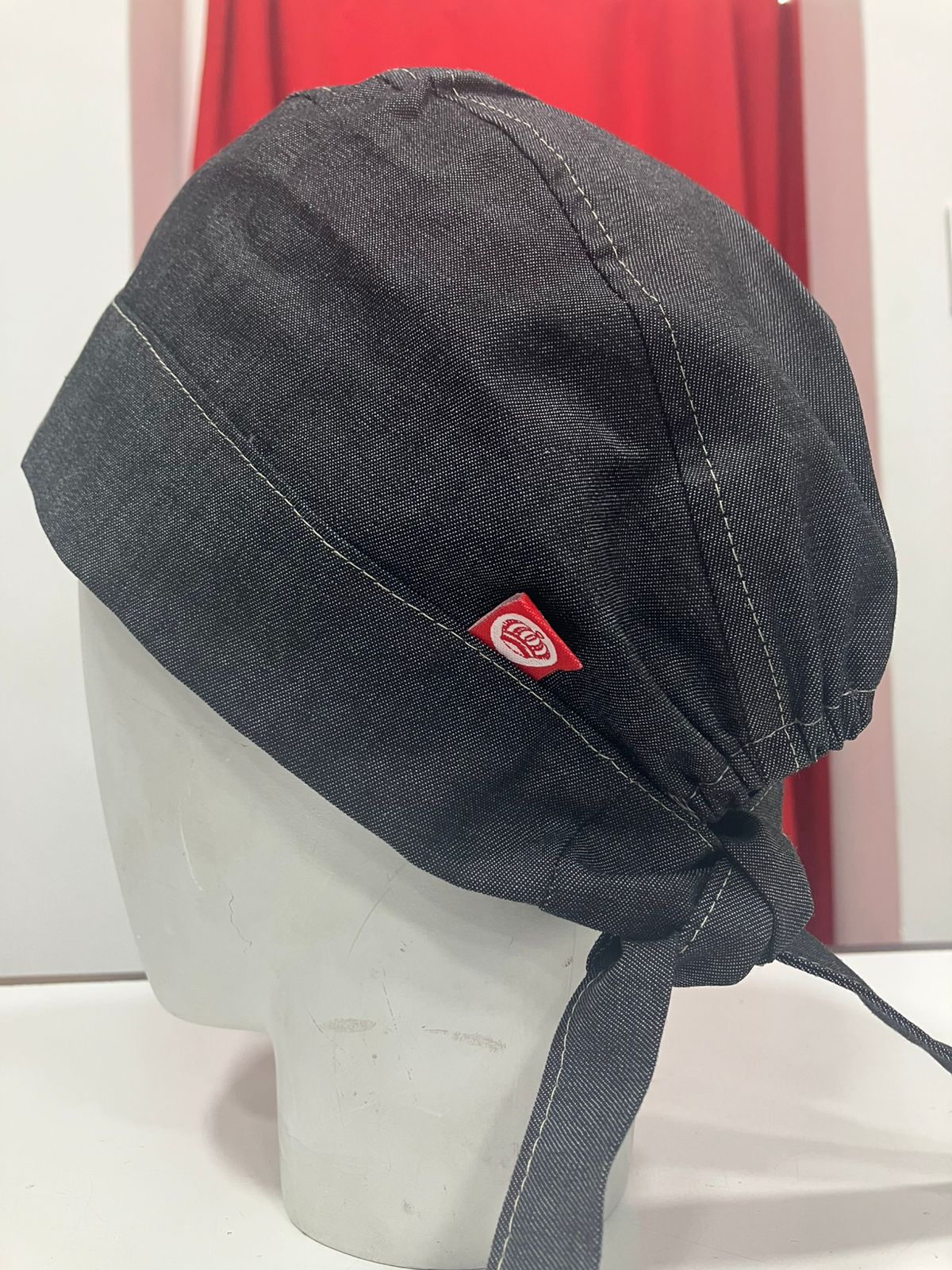Gorro tipo Bandana en mezclilla delgada con amarras y elástico en la parte de atrás de la cabeza, permitiendo mayor flexibilidad o amplitud si se requiere.