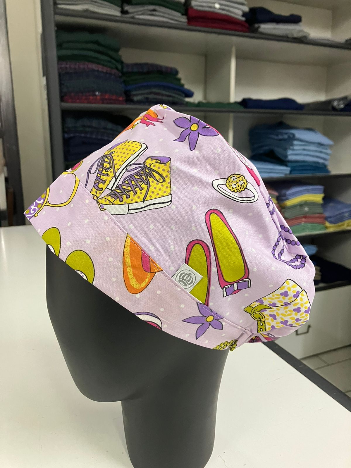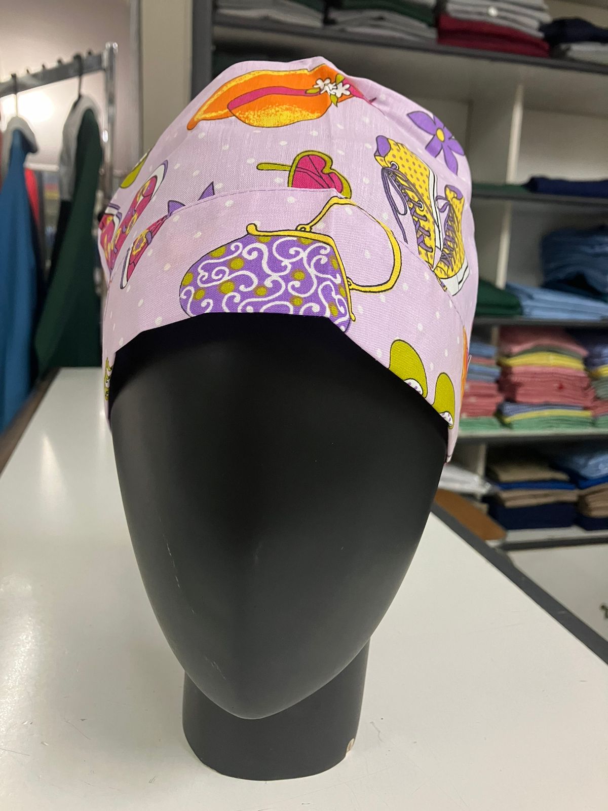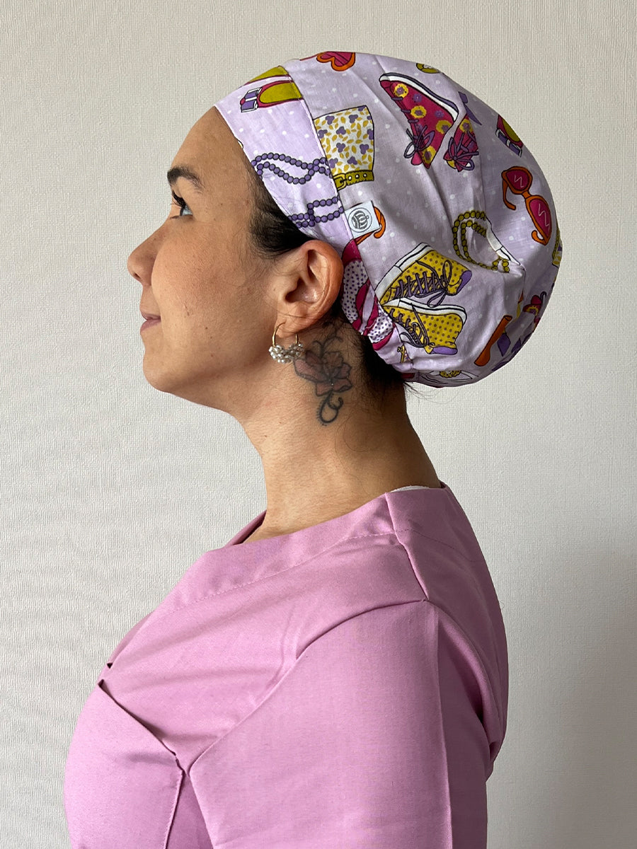 Gorro Paris en tela poli algodón delgada estampado con motivos de zapatos y anteojos en colores lila.