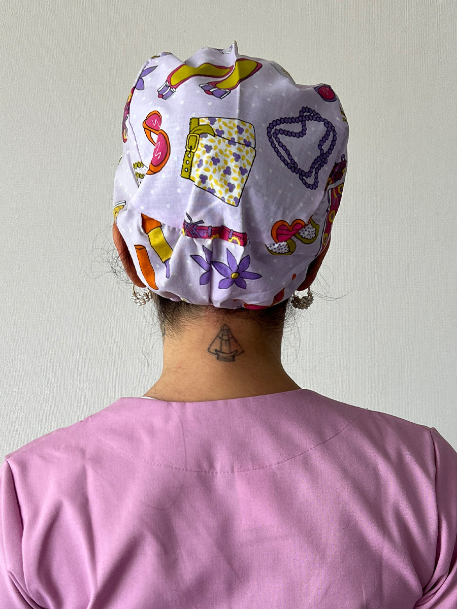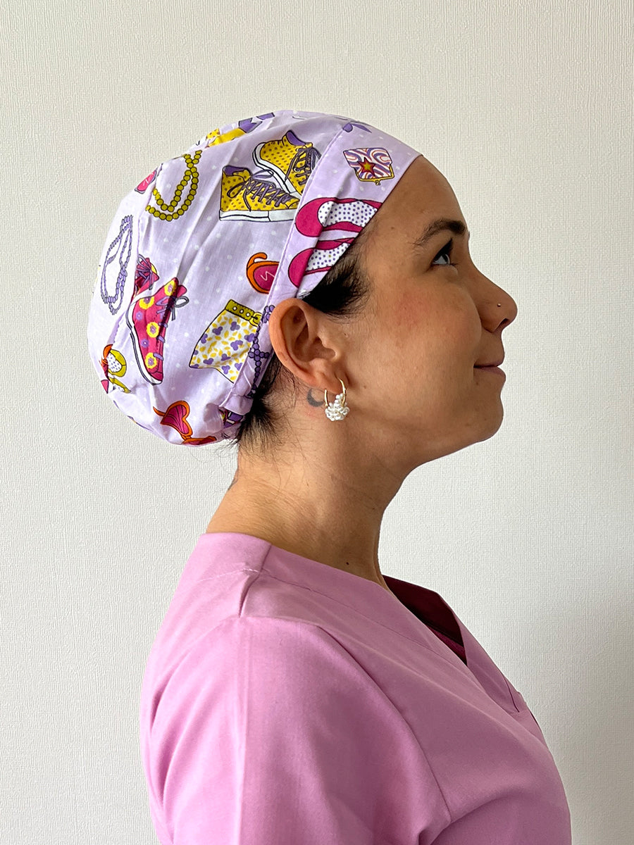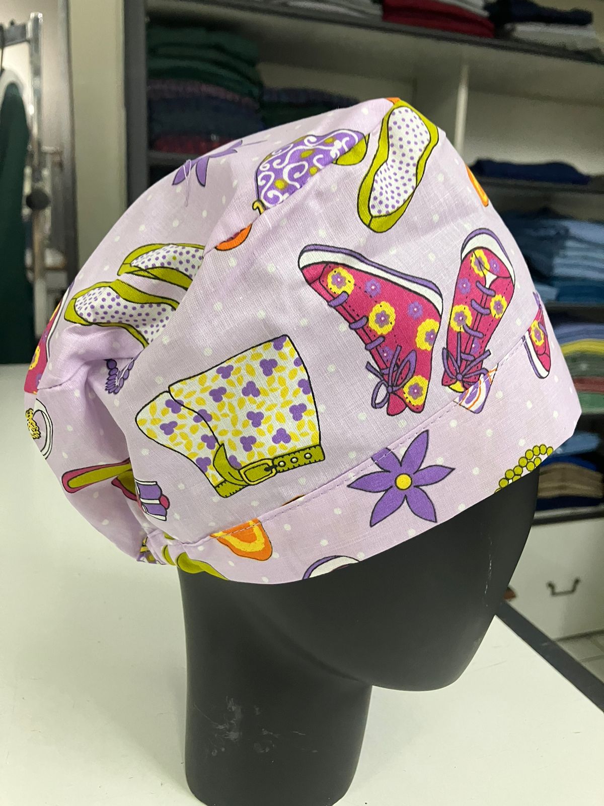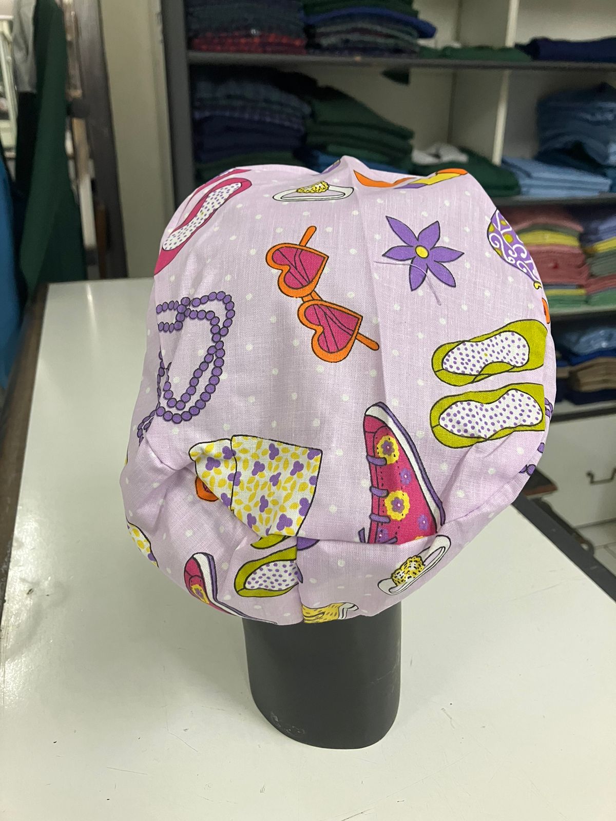 Gorro Paris en tela poli algodón delgada estampado con motivos de zapatos y anteojos en colores lila.