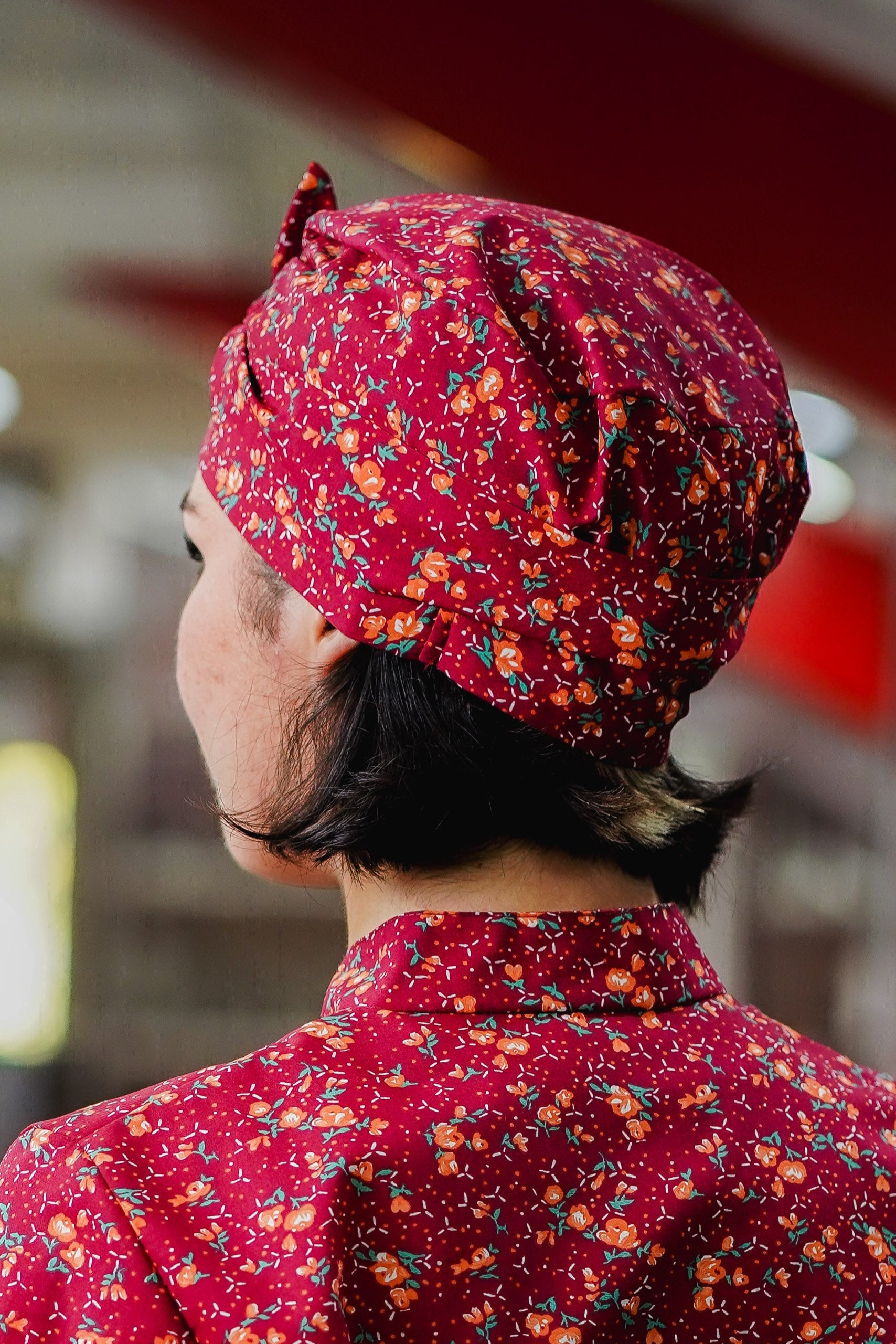 Confeccionado en tela delgada burdeo con flores naranjas y ramitas verdes, este gorro une comodidad y estilo en una sola pieza.