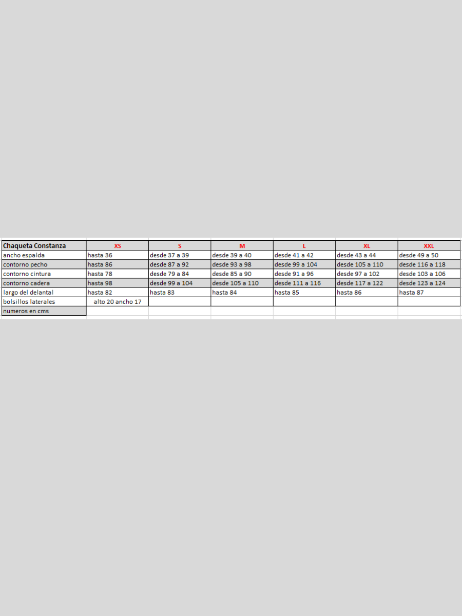 El modelo Delantal Americano esta disponible desde la talla XS a la XL