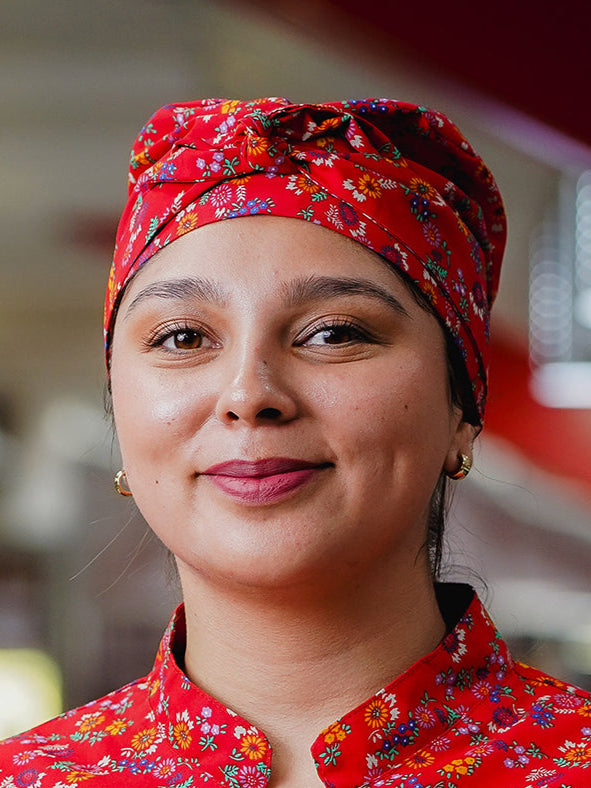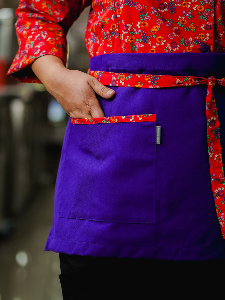 Calce ajustado, abotonadura lateral y estampado floral sobre fondo rojo. Botones morados que completan el look.