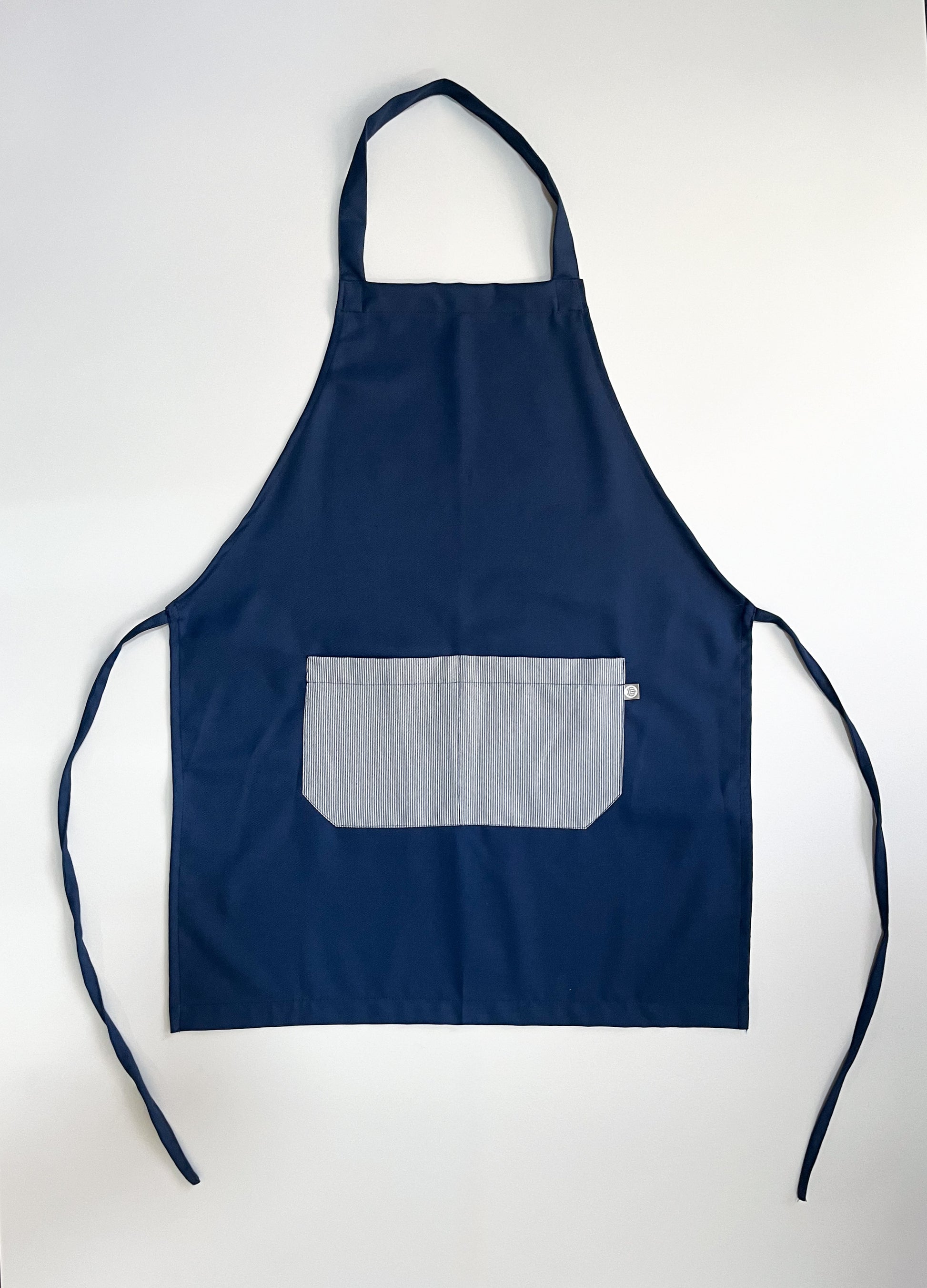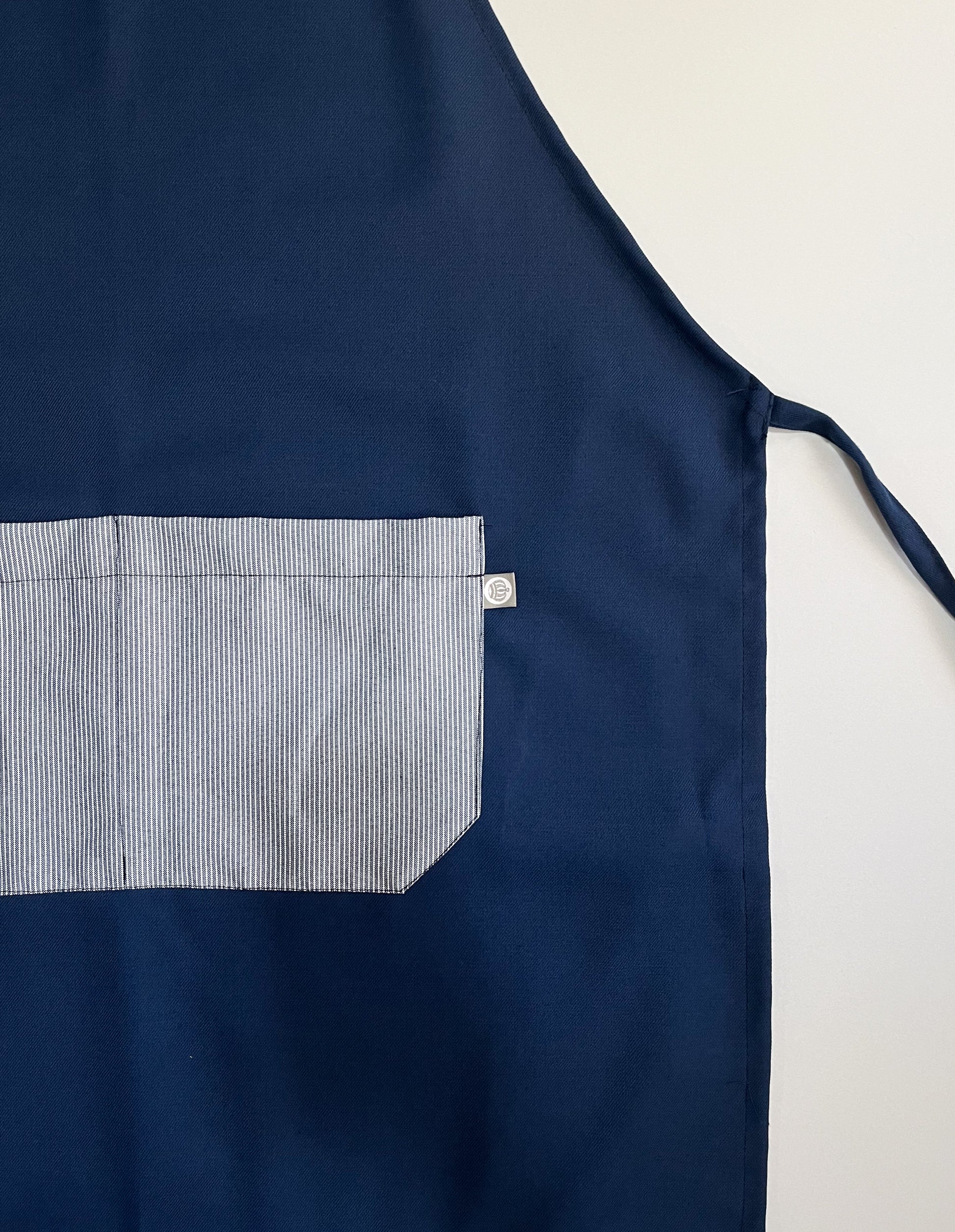 Tiene un bolsillo separado en dos compartimentos confeccionado en una tela estampada azul al tono.